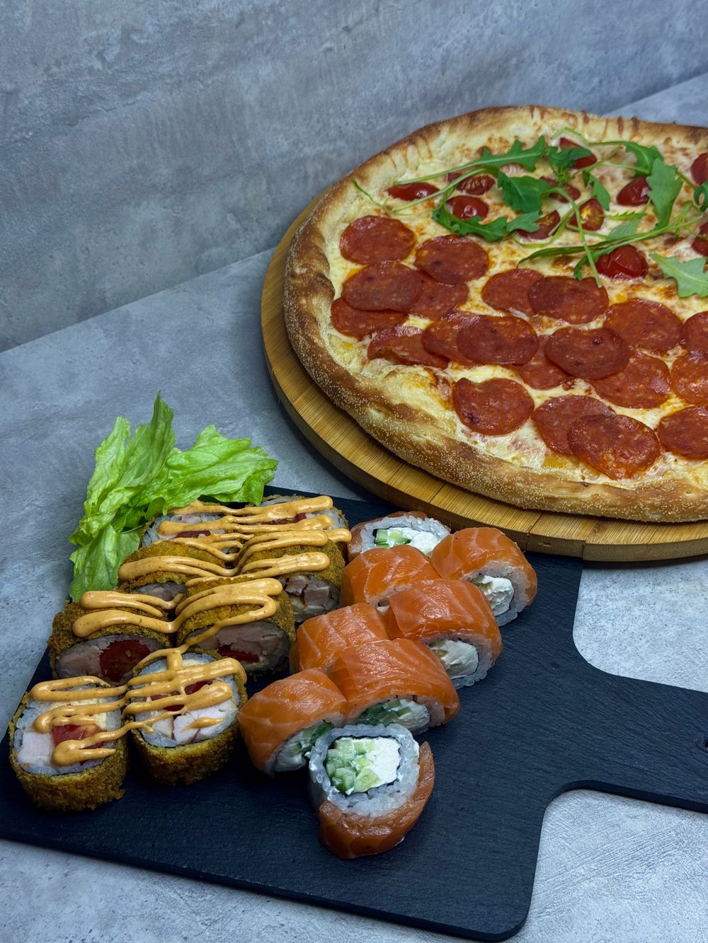 Пицца Пепперони 1/2 Пицца Маргарита 1/2 Ролл Филадельфия М Ролл Цезарь Темпура